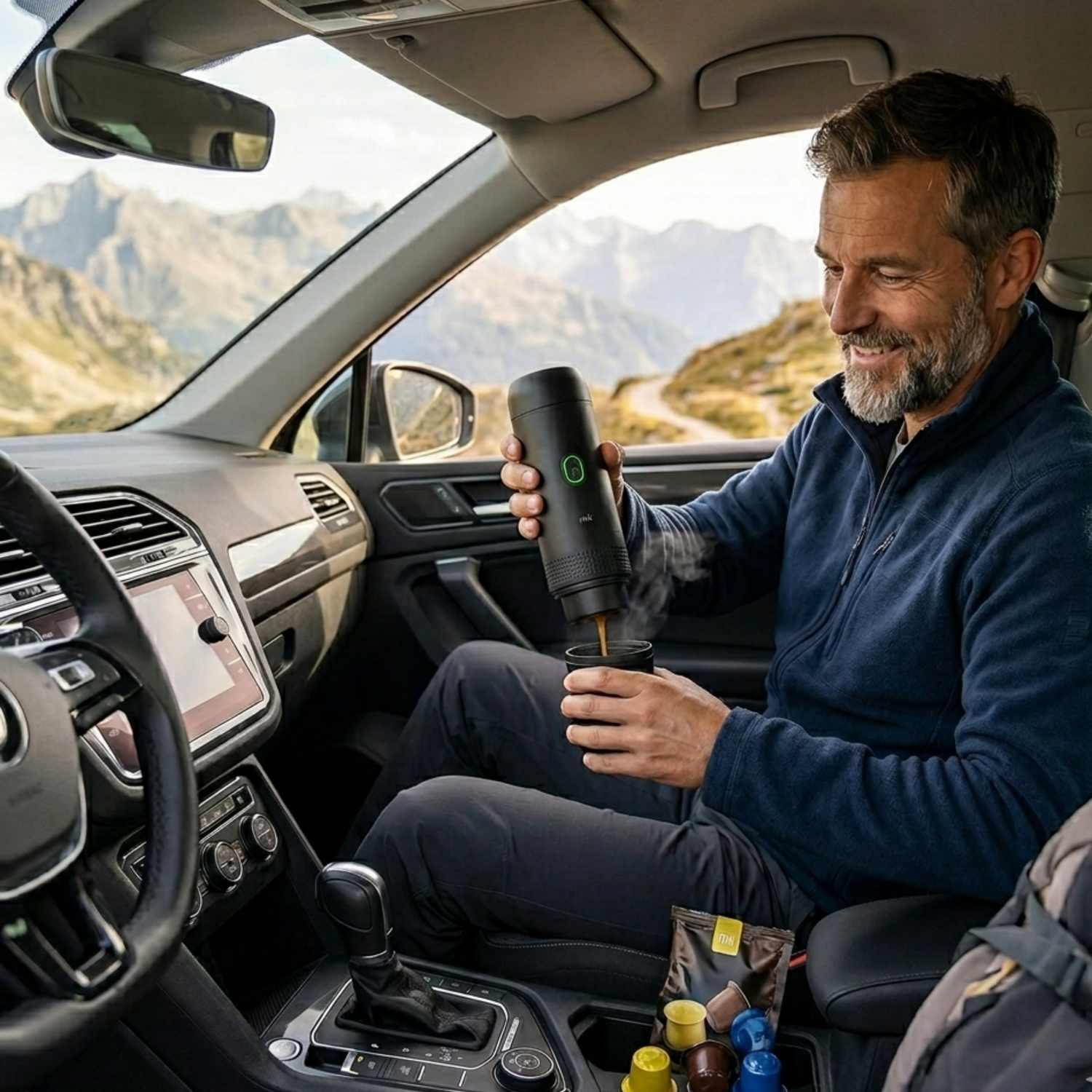 Diese Kaffeemaschine wurde entwickelt, um Sie überallhin zu begleiten, und vereint Kompaktheit mit Flexibilität. Dank ihres handlichen Formats passt sie problemlos in jede Tasche oder ins Auto, sodass Sie jederzeit einen guten Kaffee genießen können.